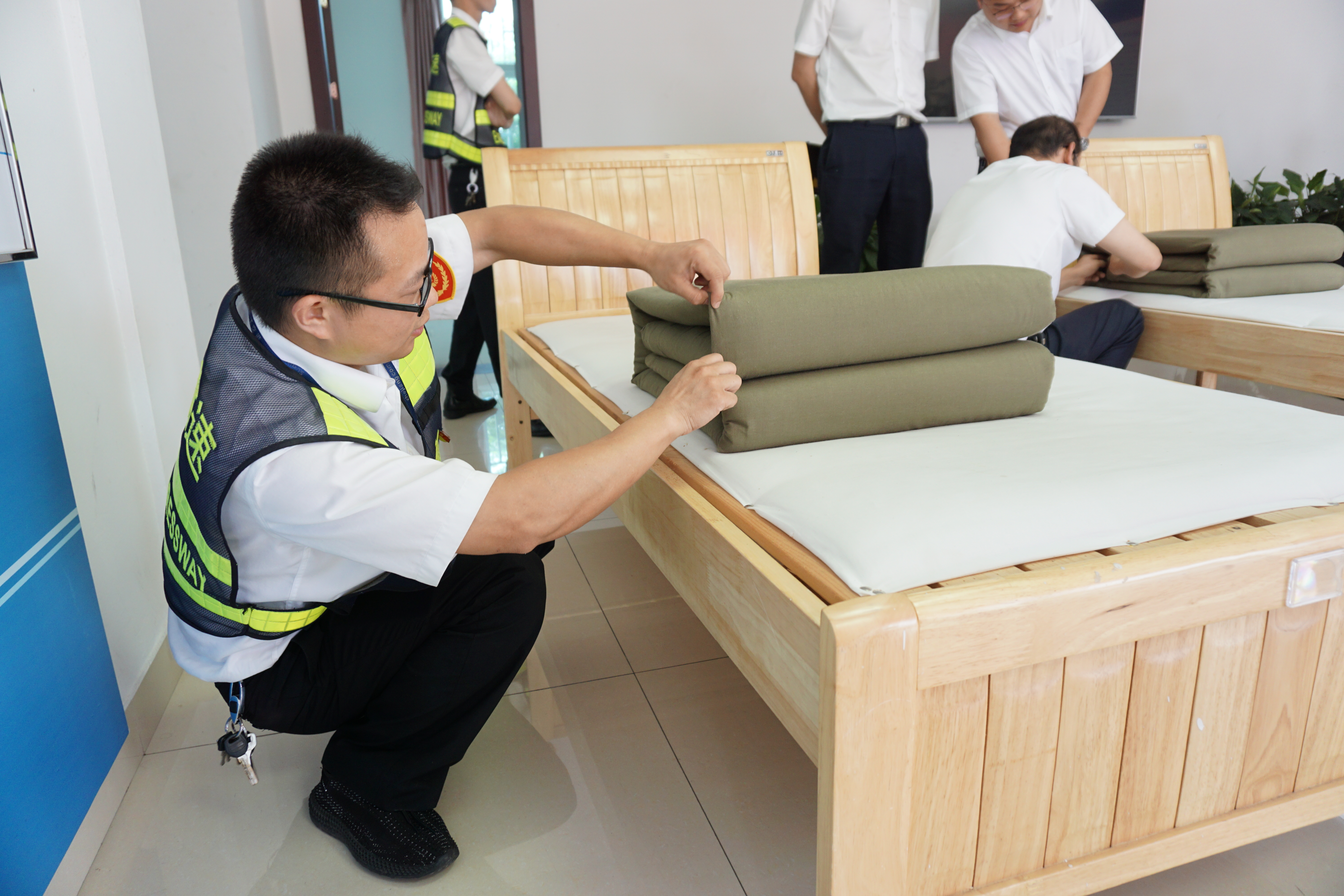 圖為比賽現場 活動現場,裁判宣布比賽規則及打分標準:評分從被子整體形狀、平整度、棱角明顯、折疊時間等方面判斷,規定在5分鐘內完成,共設置一、二、三等獎三個獎項。內務半軍事化在該所已是常態,參賽選手們很快進入狀態,從鋪到疊再到整,駕輕就熟,均能在規定時間內整出“豆腐塊”。評委現場進行點評和打分。經過競逐,最后副站收費四班何翊平奪得一等獎。比賽分四輪進行,且全程用時不到1個小時。