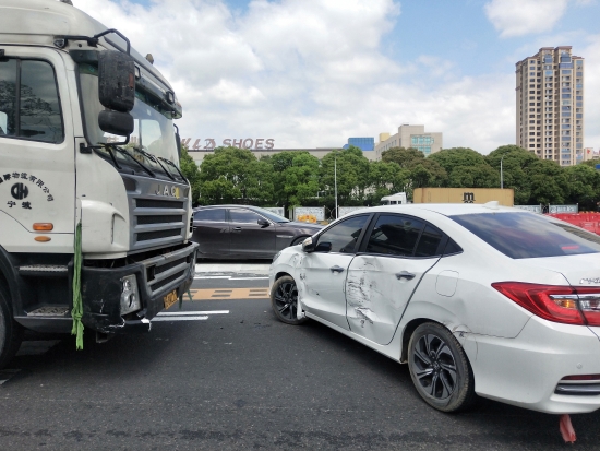 圖為事故現(xiàn)場(chǎng) 聽到巨響,收費(fèi)員立即上前查看,所幸兩車司機(jī)都安好,便立即開啟備用車道,以保證其他車輛通行順暢,并且在事故車輛后方放上小紅帽,告知后方來車及時(shí)駛?cè)肫渌嚨?。而兩車司機(jī)快速撥打交警電話,并且拍照留證,以最快的速度駛出收費(fèi)站靠邊等待交警處理。 經(jīng)調(diào)取錄像,查看事故緣由。“真相”竟是集裝箱司機(jī)引發(fā)的,該車從杭州寧波方向過來,小轎車司機(jī)從溫州方向匝道駛出,由于集裝箱司機(jī)下橋時(shí)沒有注意右方來車,只顧自己右拐車道,直接頂著轎車開出50多米,所幸未造成人員傷亡。 在此小編提醒大家:在駛?cè)朐训赖臅r(shí)候,司機(jī)要減速行駛;在選擇出口車道的時(shí)候,要仔細(xì)查看前后方和左右來車,且不要突然變更車道,否則容易造成車輛之間的親密“接觸”。 只有文明安全行駛,才是對(duì)自己和他人最好的保護(hù)。 鄭霞霞