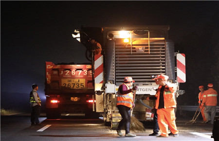 4月25日清晨5時,歷時14天的的第一階段路面維修專項施工圓滿結束,比原定公告施工封道日期整整提前了15天。計劃內7公里的合格不達標路段和省督辦的2座橋頭跳的施工任務順利完成,共計瀝青砼鋪筑(含調拱調坡)10000余噸,其中調拱調坡處治約900米,橋面處治約150米,罩面約5200米,病害處置約1800米,橋頭跳24處,伸縮縫處理90余條。