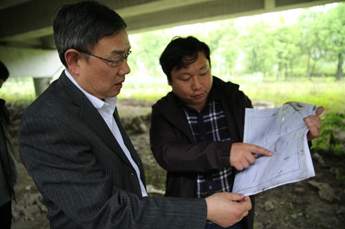 圖為在院橋互通1號橋檢查 細雨中,陳文波一行踏勘走訪了院橋大拉溝104國道跨高速公路主線施工現(xiàn)場、庫灘橋14國道橋洞、院橋互通1號橋等地,了解在實際工作中存在的一些難點問題和存在的安全隱患。