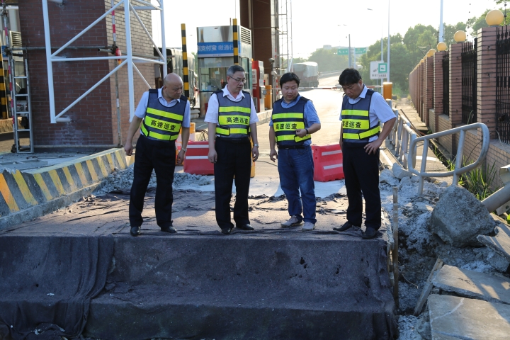 圖為陳文波檢查臺(tái)州收費(fèi)站內(nèi)廣場(chǎng)隔離墻