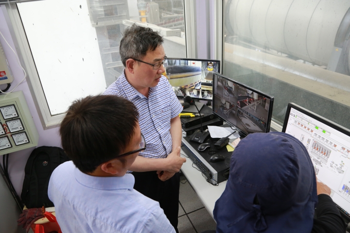 圖為陳文波一行在山海公司瀝青拌合站現(xiàn)場調(diào)研