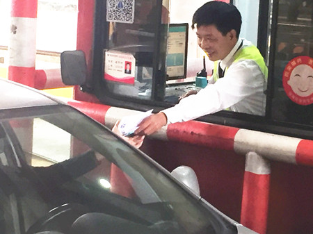 圖為工作人員向過往司機發(fā)放施工傳單