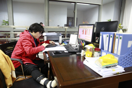 圖為股權投資部李茜茜帶傷工作現場 “每天,我們會第一時間審核各收購點上報的資料,如果發現股東身份證、銀行賬號等信息不準確,我會及時聯系收購點。”負責股權收購后臺數據匹配處理、收購款匯總、股權過戶等工作的李茜茜,對待每個環節都十分細致認真,為確保各類數據準確無誤,她都要經過多番核對,當確定下收購款匯總表時,便及時與財務結算中心對接,不讓任何一環掉鏈子。 10月21日,腳不慎扭傷而無法行走的李茜茜,考慮到股權收購正處于緊要關頭,工作量大,數據處理復雜,人手緊缺等各方因素,她放心不下,堅持帶傷上崗,并主動要求家人到單位照顧日常生活,集團辦公室專門調出休息室供其臨時使用。 “我們很理解支持女兒的工作,也很感謝臺州高速對我們的關懷,希望她盡心盡力做好工作。”李茜茜父母自知道女兒受傷那天起,便放下手中事,專門從溫嶺趕來讓女兒安心工作,一家三口助力完成股權收購工作。 據股權投資部副經理楊靜介紹,李茜茜在股權投資部已有兩年,還有股權代理點一線業務經驗,平日好學的她,無論是在業務專業知識還是數據軟件處理上,都非常嫻熟,在這樣的收購關鍵時期,其他人員無法有效代替她的工作。 自集團股權收購工作開展以來,收購一線繁忙的景象每日在“股權收購點工作小組”微信群里呈現,幕后的工作人員也常常加班加點,幾乎沒有正常的上下班時間,受傷的李茜茜同其他人一樣毫無怨言,每日堅持完成各項工作,大家團結一致,確保股權收購順利推進。 陳林偉