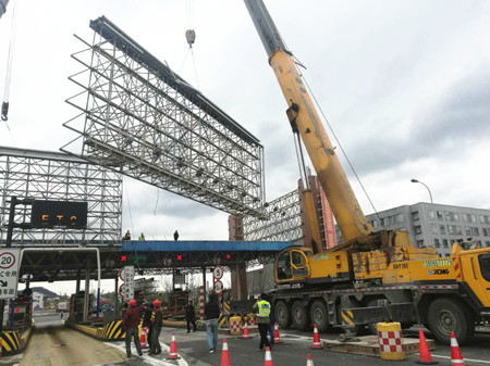 據悉,臺州收費站頂棚鋼結構廣告總重106噸,總面積達850平方米,頂棚下車流密集,給拆卸作業帶來了嚴峻的考驗。“這項工程涉及高空作業,站頂棚風大又冷,稍有不慎就有可能危及施工人員和過往司乘的安全,我們得時刻關注過站車流量,還有易燃易爆危險車,視車流情況開放施工出口匝道,斷斷續續切割廣告牌,避開車流高峰,確保高速主線行車安全。”楊金梁一刻不離地駐守在施工現場。安全責任大于天大,就連當天他的父親動手術他都沒能陪伴身邊。