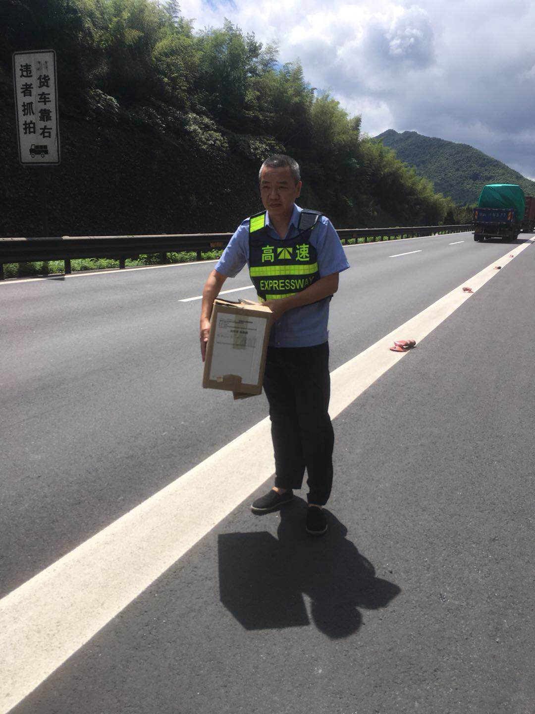 “咦,那邊路上有一個紙箱,快開過去看看。”8月24日上午10點左右,黃土嶺隧道所執勤隊進行日常巡邏時發現高速路上立有一個紙箱,為了不影響交通,執勤隊員立即將包裹挪離路面,排除安全隱患,避免影響車輛正常通行。 這個紙箱是一份快件,大約十來斤重,上面赫然貼著包裹的信息,由山東發往溫州樂清市的汽車配件。這樣的大包裹遺失,失主知道后肯定萬分著急!執勤隊員為了讓這滑落的包裹盡快找回主人,一遍遍撥打快件單上那字跡模糊的電話號碼,經多方詢問終于找到了該家物流公司負責人。