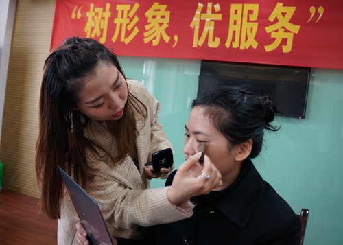 圖為員工練習(xí)化妝 通過培訓(xùn),大家掌握了妝容的基礎(chǔ)知識和化妝的基本技巧,這不僅有助于提升自我形象和精神面貌,而且帶妝上崗能夠靚化窗口形象。 楊雅芬
