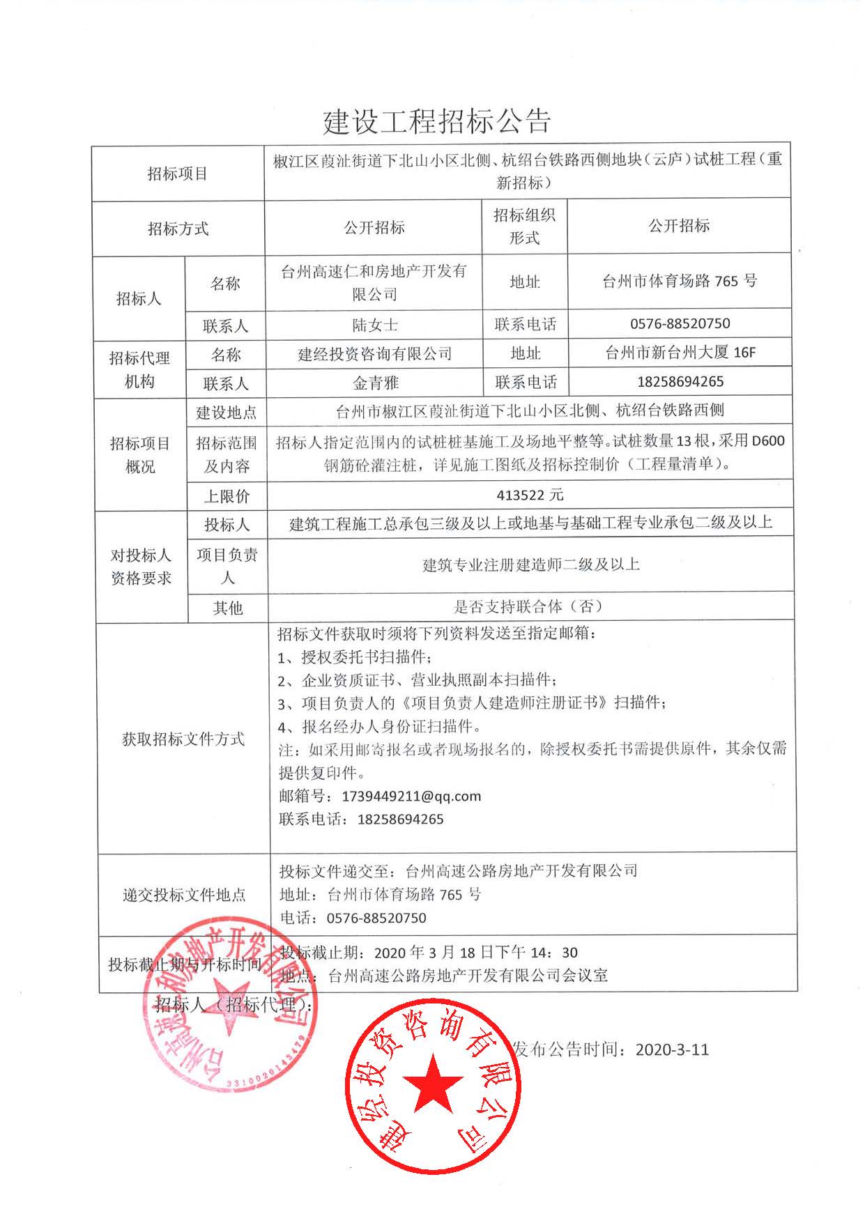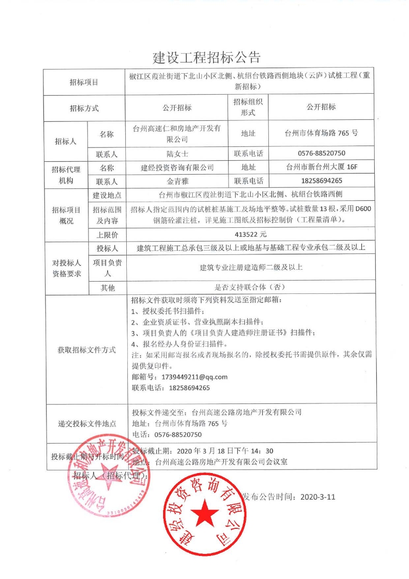 椒江區葭沚街道下北山小區北側、杭紹臺鐵路西側地塊(云廬)試樁工程(重新招標)公告