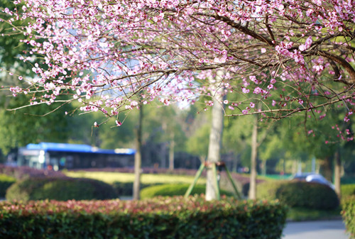 最后一站,便是市民廣場(chǎng),我見(jiàn)過(guò)的最美公交站臺(tái)。初春的清晨啊,一下車便有沁香拂散,迎接我下車的那是大片繁花盛開(kāi)呀,路邊草地一溜的紅梅、白梅,在藍(lán)天下絢爛地肆無(wú)忌憚地綻放。呵,是的,還有藍(lán)天,最近流行的一個(gè)詞叫“臺(tái)州藍(lán)”,忽然想起來(lái),每日公交車上下班,低碳出行,這算是我為“臺(tái)州藍(lán)”添了一筆淡藍(lán)嗎?應(yīng)該是吧。于是,在藍(lán)天紅白花海中,慢慢穿過(guò)梅林、小橋、亭子,上班之路竟是如此心情舒緩。 鄭蔚