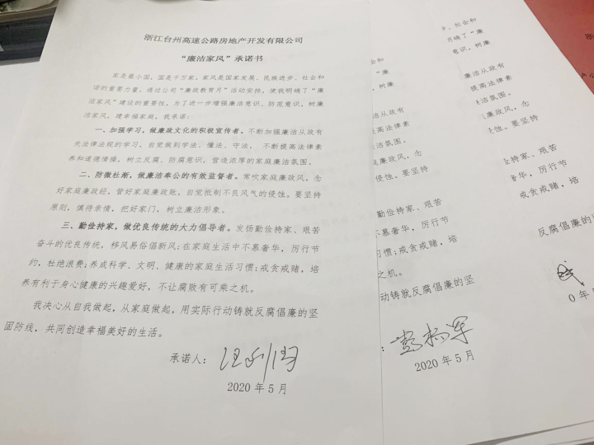 圖為全體黨員觀看廉政教育短視頻《國畫》  圖為簽訂“廉潔家風”承諾書 根據集團公司《關于組織開展“廉政教育月”活動的通知》文件要求,為推動“不忘初心、牢記使命”主題教育常態化,深入學習貫徹黨的十九大和十九屆二中、三中、四中全會及十九屆中紀委四次全會精神,嚴守黨的政治紀律和政治規矩,更好地落實黨風廉政建設有關要求,高速房產公司黨支部組織了這次專題活動。全體參會人員一起觀看廉政教育視頻,宣讀“廉潔家風”倡議書,簽訂“廉潔家風”承諾書,開展“廉潔文明家風,黨員干部示范”大討論。 此次黨風廉政專題活動進一步增強了黨員干部的廉潔意識、防范意識,起到帶頭正品行、立家規、嚴家教、樹家風建設的表率作用,以好家風促黨風帶社風民風,為新形勢下臺州高速房產事業貢獻力量。 鄭攀
