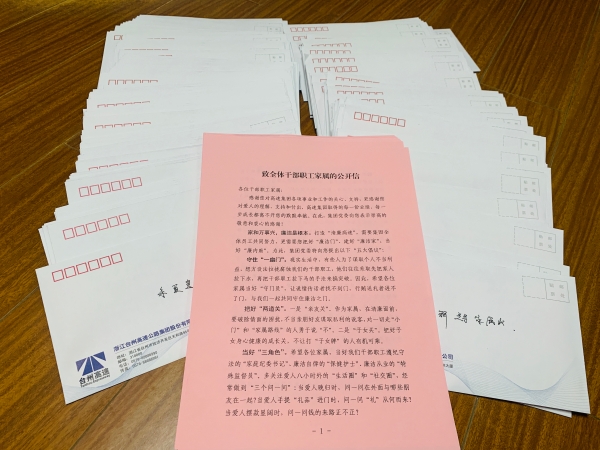 集團(tuán)開展致全體干部職工家屬的公開信活動(dòng) 6月18日,集團(tuán)緊貼廉政教育月活動(dòng)要求,將“致全體干部職工家屬的公開信”交到每一名職工手中,以這種家書形式廣泛宣傳廉潔清正的重要性,呼吁他們爭(zhēng)當(dāng)反腐倡廉的“廉內(nèi)助”。